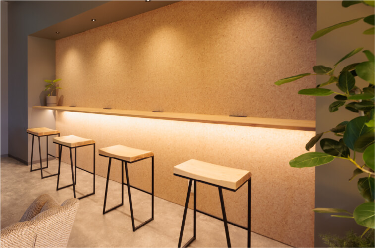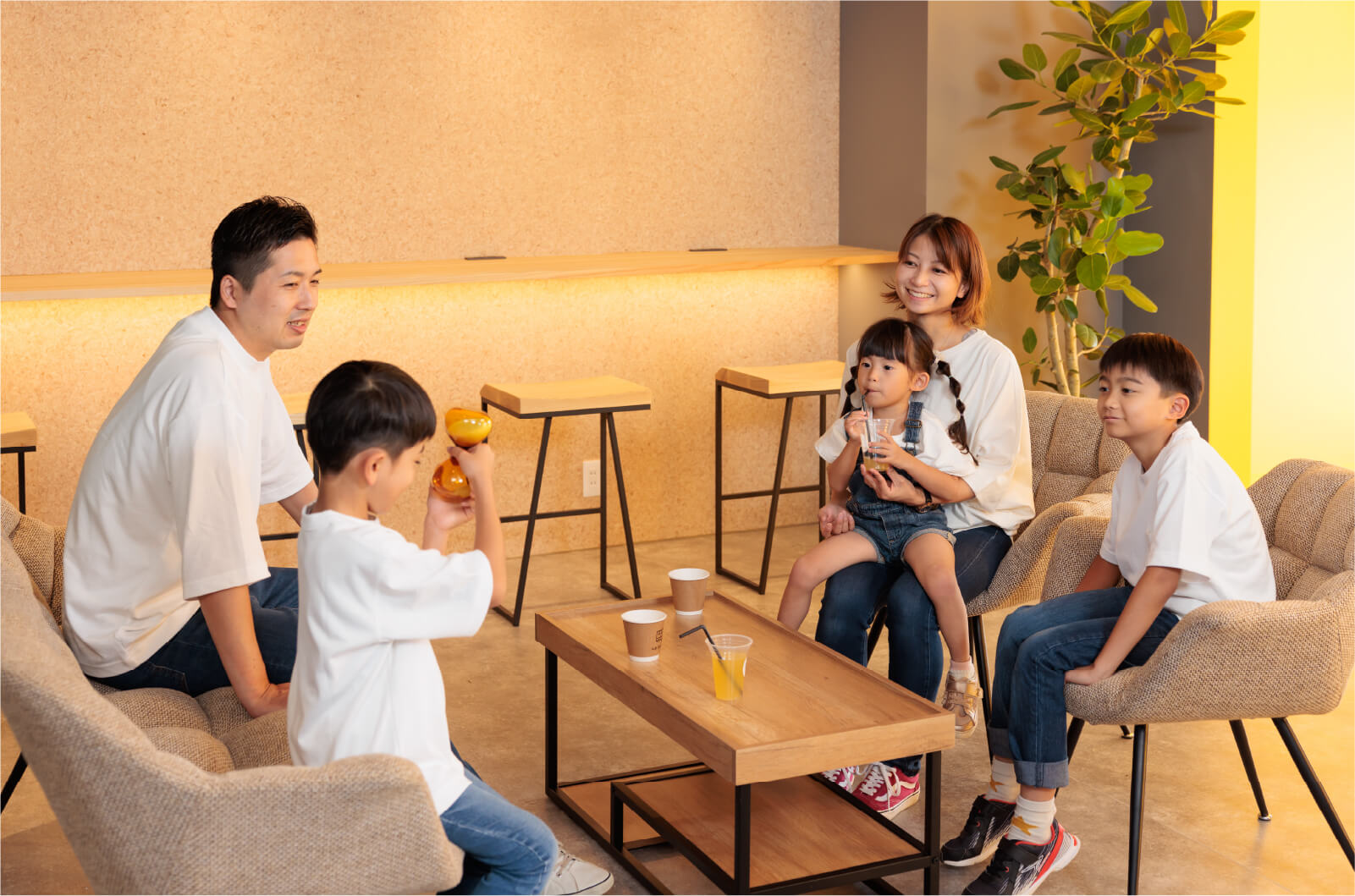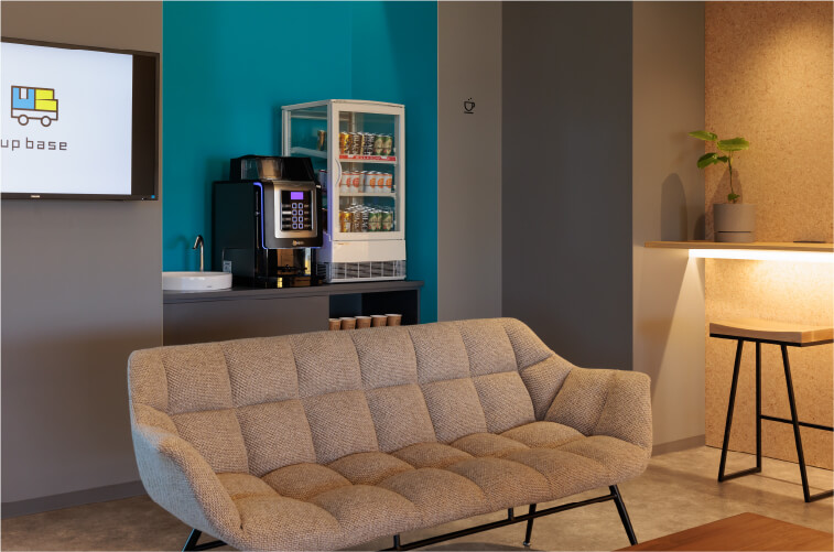 修理やメンテナンスなどでお待ちいただく時間は、ぜひupbase本社2Fのリラックススペースでゆっくりおくつろぎください。みんなで座れるゆったりソファや、読書などにぴったりのカウンターテーブル(お一人用)席をご用意しています。セルフで利用できるメニュー充実のフリードリンクスタンドも設置していますので、快適なひとときをどうぞ。